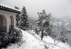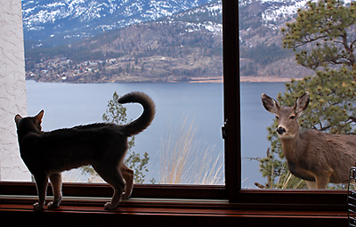 We are on a treed acreage with views of lake, deer and other animals, and many birds.