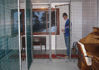 We do not cage our cats. Our females are free to explore and our males have their own areas with vinyl screens